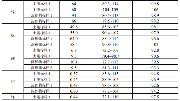 11.4 每批次樣品至少分析 10% 的加標(biāo)回收樣,樣品數(shù)量小于 10 個(gè)時(shí),應(yīng)至少做一個(gè)加標(biāo) 回收樣。加標(biāo)回收樣測定結(jié)果中,電熱板消解測定鎘(Cd)、鈷(Co)、銅(Cu)、鉻(Cr)、 錳(Mn)、鎳(Ni )、鉛(Pb)、鋅(Zn)、釩(V)、砷(As)的加標(biāo)回收率應(yīng)控制在 70% ~ 125%之間,鉬(Mo)、銻(Sb)的加標(biāo)回收率應(yīng)控制在 50% ~125%之間;微波消解測定 12 種金屬元素的加標(biāo)回收率應(yīng)控制在70% ~125%之間。