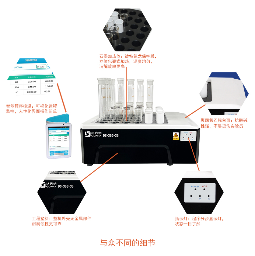 石墨體表面噴涂特氟龍涂層,易清潔,耐腐蝕,整機(jī)外圍無金屬部件,可在強(qiáng)酸強(qiáng)堿等腐蝕環(huán)境中放心使用。36孔設(shè)計(jì),可批量消解,操作簡單省時(shí)。
