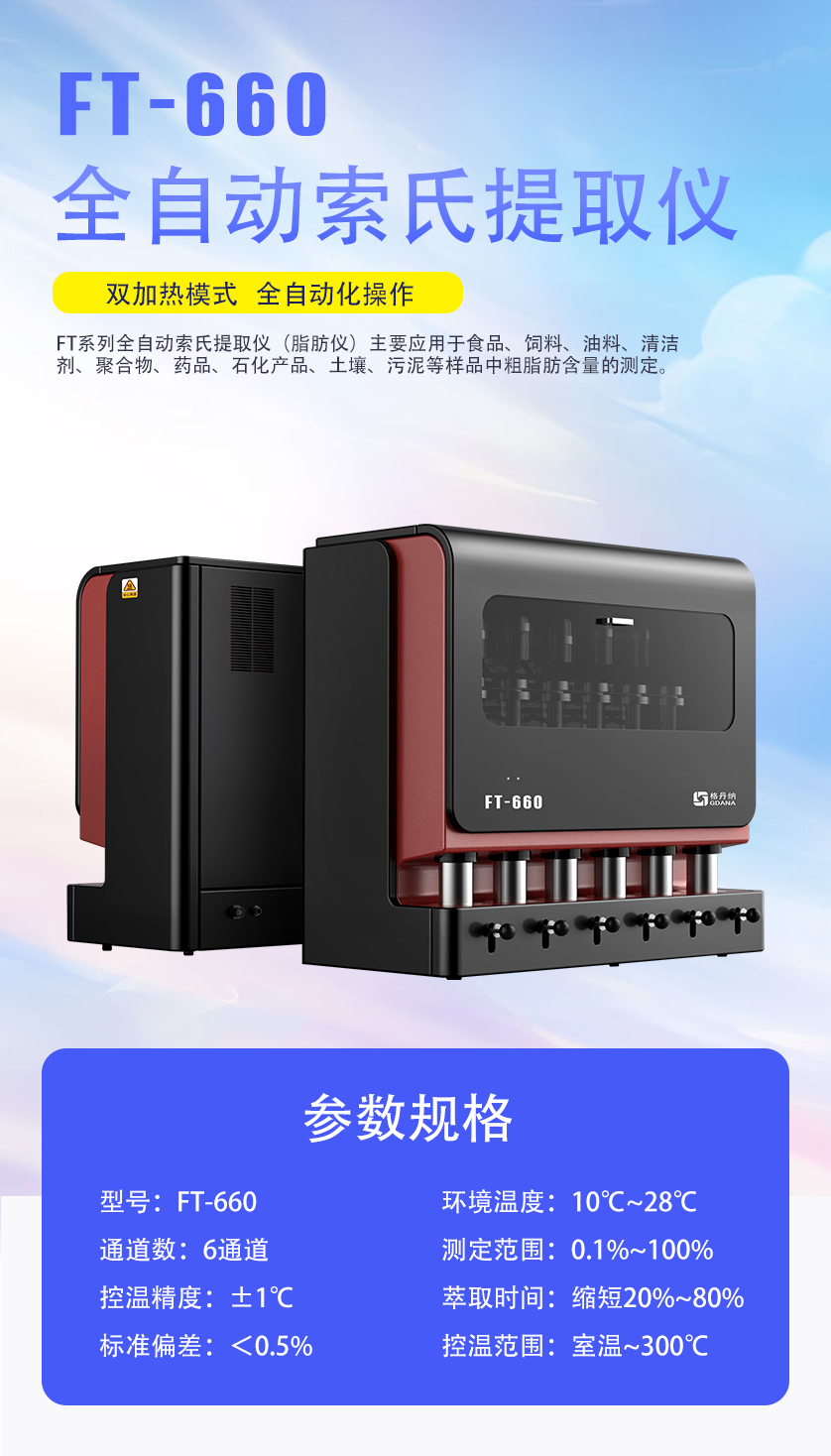 FT-660全自動(dòng)索氏提取儀(脂肪測(cè)定儀)主要應(yīng)用于食品、飼料、油料、清潔劑、聚合物、藥品、石化產(chǎn)品、土壤、污泥等樣品中粗脂肪含量的測(cè)定。
