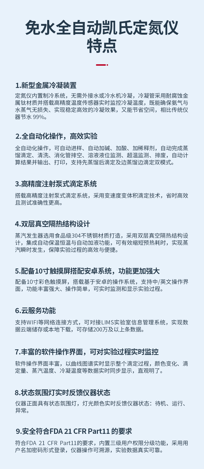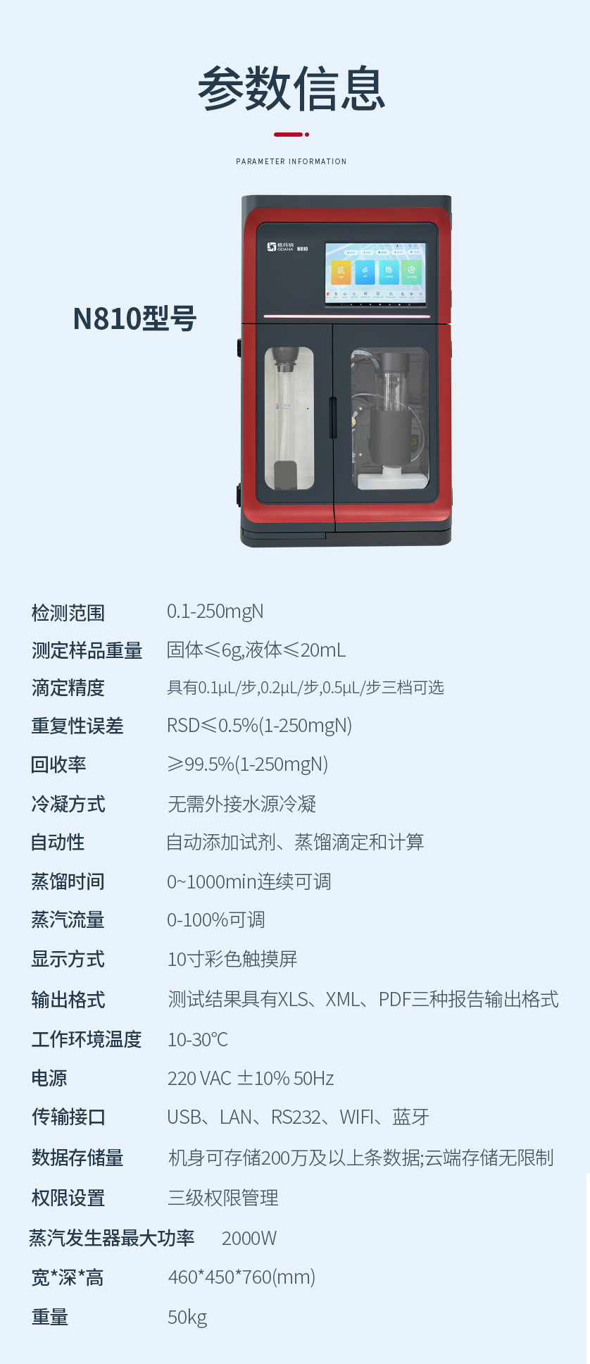 新一代N810免水全自動凱氏定氮儀,突破了傳統(tǒng)凱氏定氮儀依賴外接水源或冷水機冷凝的局限,搭載免水冷卻系統(tǒng),既提升了實驗的準確度與效率,更增強了儀器運行的可靠性。這一創(chuàng)新設計,大幅節(jié)省了外接冷卻水循環(huán)機的采購成本與日常水資源開支。儀器集成免水冷凝、自動加堿加酸、加注稀釋劑、蒸餾滴定、消化管排空、溶液液位監(jiān)測、超溫預警、清洗排廢、結果智能計算等全流程功能,實現(xiàn)凱氏定氮實驗的無人值守式操作。儀器采用符合國家標準的凱氏定氮方法:濃硫酸環(huán)境消解樣品、堿性環(huán)境蒸汽蒸餾、硼酸吸收、加指示劑滴定、終點顏色判定法。